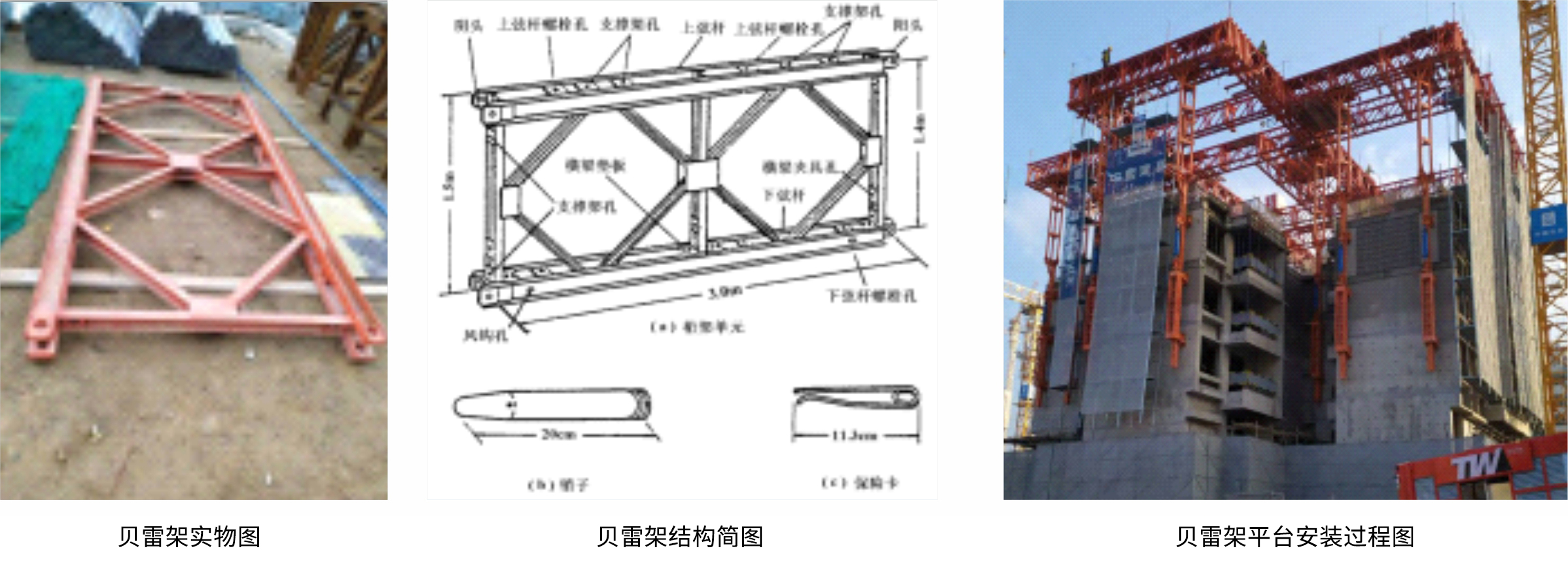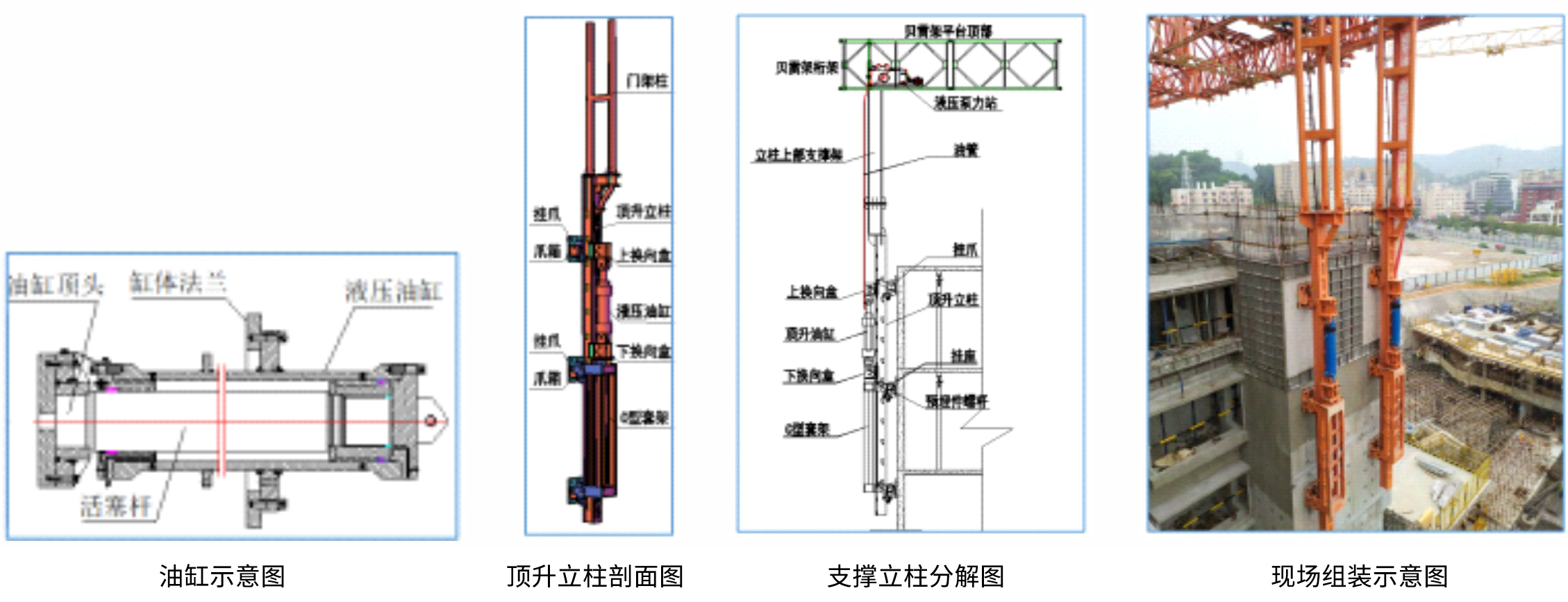 · 鋼平臺系統:321型貝雷架連接組成(長300X高150 CM); · 支撐系統:導軌立柱、門架柱及附墻導座; · 動力及控制系統:小行程、小噸位液壓油缸; · 模板系統:鋁合金模板; · 掛架系統:輕型吊掛架; · 安全防護系統:平臺上部防護、走道板。 |