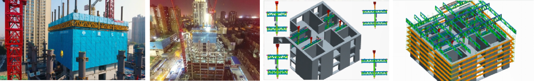 由頂部平臺及鋼桁架系統、“懸掛式”支撐及液壓頂升系統、電控系統、內外掛架系統、模板系統五大系統以及全過程安全防護系統組成。屬于少支點大型程油缸支撐系統,液壓油缸驅動的支撐主立柱懸臂坐在下層墻體及下下層墻體上。上采用輕量化設計理念。具有構件輕,自重小,承載力強,集成能力強,電梯直達平臺。頂升、安拆、施工速度快。操作更方便,增加可靠性,降低風險。我們前期的項目,基本上采用這種“懸掛式”智能建造機,比如長沙三角洲北辰項目、西安榮民金融中心項目等。
